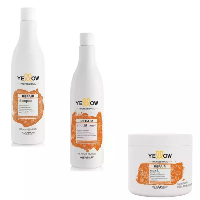 O Kit Yellow Repair 500ml é o tratamento ideal para cabelos danificados, quebradiços ou enfraquecidos por químicas, calor ou agressões externas. Composto por shampoo, condicionador e máscara de 500ml cada, o kit promove uma reconstrução completa e duradoura, restaurando a saúde dos fios desde a primeira aplicação.